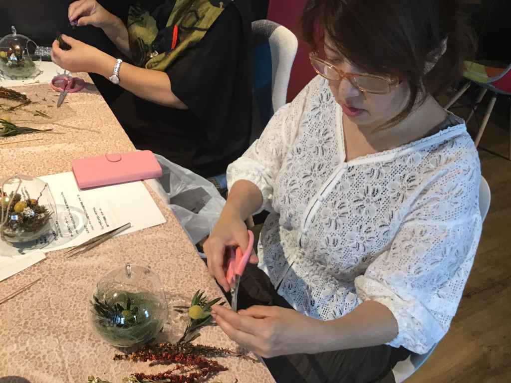 大阪と兵庫で ワイルドフラワーデザインスクールと プリザーブドフラワーデザインスクールの インストラクターと ハンドメイド雑貨を販売しています アトリエ リボン・ピーの 荳果(とうか)です。 ご訪問頂きありがとうございます。 昨日はワイルドフラワーデザインスクール心斎橋教室 で『ハンギンググラス』のワークショップでした 前にもワークショップにご参加くださったお2人が来てくださいました(^^♪ それ...