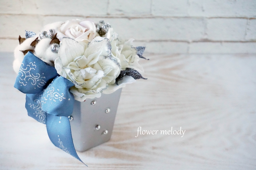 シルバーの陶器の花器に ラメ入りアーティフィシャルフラワー、コットンの実などをアレンジしました。 リボンはタフタのような張りのある素材にラメの柄が上品に光っています。 大人な雰囲気のクリスマスアレンジがお好きな方に・・・ minneでの作品詳細はこちら★。 後日、アトリエ・どんパさんにも納品いたします。 お友達や生徒さんは直接お声がけくださいませ。 〜〜〜〜〜...