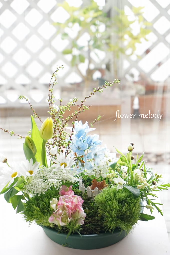 昨日のプチアレンジonedayレッスンのご報告です。 直径約18?ほどの器に、小さなお庭をアレンジしました。 白い柵の中でお行儀よく卵を温めるにわとりさん。 イースターに備えているのかしらん・・・ こちらも、春爛漫のお庭で・・・ 静かに目を細めながら卵を温めております。 雪柳は蕾の状態ですので 開花すると、とっても華やかなお庭になります♪ ちなみに、...