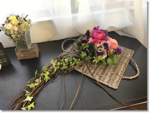 今回のフラワーアレンジメントは、 スクエアフレームアレンジメントでした。 (これは去年の11月のアレンジです) スクエアのアウトラインを意識しながら 花材の特徴を生かしてアレンジします