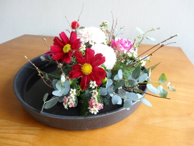 今回のフラワーアレンジメントは、秋のディッシュアレンジメントでした。 (これも去年の10月のレッスンですが) タイトルの通り、丸い皿状の花器に作った秋のアレンジメントです