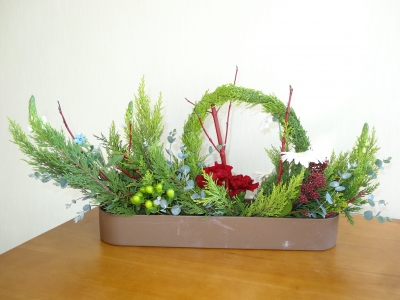 今年のクリスマスのアレンジは、 グリーンリースクリスマスアレンジメントでした。 リースのオブジェを入れたアレンジメントです