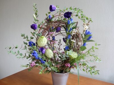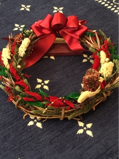 今回のフラワーアレンジメントは、秋のリースアレンジメントでした。 ナチュラル感をだした、リースアレンジメントです。 ドライ素材(使う素材の一部をあらかじめドライにする)を入れると よりリアルなドライミックス秋のリースアレンジメントになります。