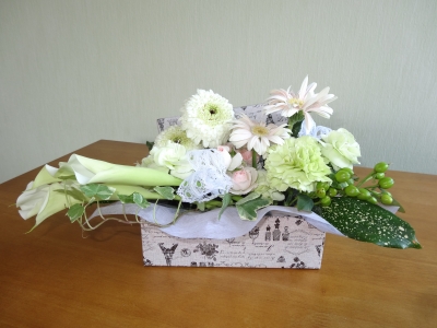 今回のフラワーアレンジメントは、シャビーシックアレンジメントでした。 大人可愛いスタイルです シャビーシックとは、「shabby=古ぼけたアンティークな」と 「chic=あかぬけた、シックな」の意味を合わせた言葉で、 「アンティークな風合いがある可愛らしい世界」と捉えられています。