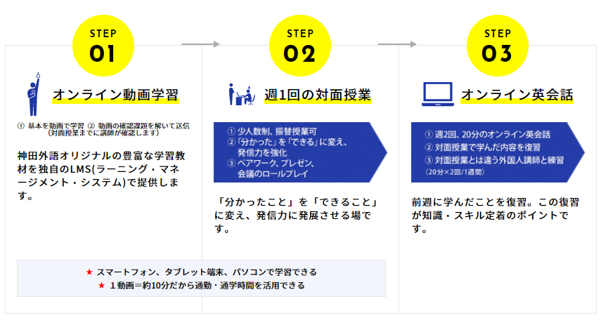 英語の学習方法がわからない方でもシステムに沿って 学習をするだけで『話せるようする』ことを実現いたします。 オンライン英会話業界ではすくない「コース」としての 学習提案方法です。 学研グループとして初のオンライン英会話ブランドです。 <コース> 学習の目標やレベルに合わせて編集された様々なカリキュラムを 予習や復習、習熟度テストを交えながら進めていきます。 オンラインレッスンの日時を指定して予約するだけで あとは「どの...