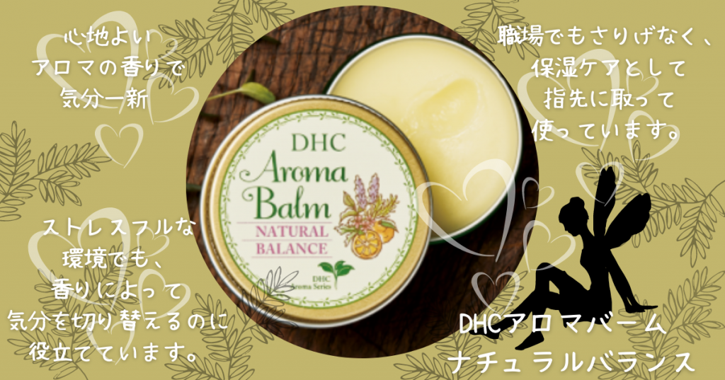 JUGEMテーマ:アロマ 心地よいアロマの香りで気分一新♡ ストレスフルな環境でも、 香りによって気分を切り替えるのに役立てています。 職場でもさりげなく、保湿ケアとして指先に取って使っています。 【DHCアロマバームナチュラルバランス】