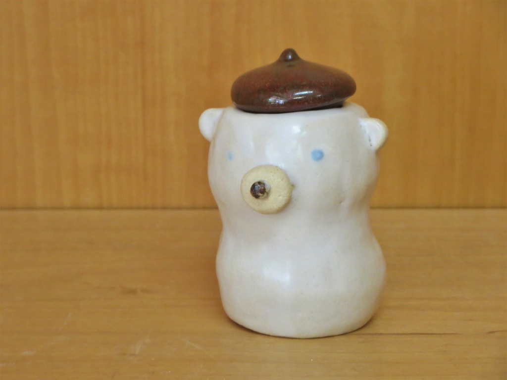 今回はかわいらしいポップな作品のご紹介です。 初めに完成作品が見れるのが、窯出しの楽しさでもあります。 窯出しの日に居合わせた生徒さんも、いろんな作品が見れるのでラッキーです。 生徒さんの作品です。クマの入れ物です。 何を入れるものなのか…忘れてしまいました。ごめんなさい。汗 ベレー帽がフタになっていて、はずれます。 白マットに目...
