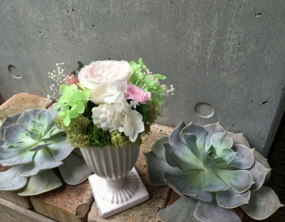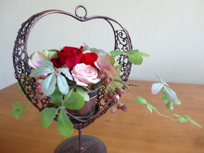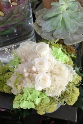 今回のフラワーアレンジメントは、プリザーブドフラワーAでした。 簡単そうに見えるけど、私には難しかったです。 ぶきっちょでセンスなしさんには難しい