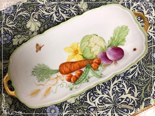 JUGEMテーマ:ポーセリン 前回マイセンの自然主義の野菜を6客描いた 何だか少し寂しいのでメインを盛り付ける大皿が欲しいなと♪ やっと仕上がったよ♪ 手付き部分を入れて35cmの長方形の皿 リム部分に小皿と一緒の深いグリーンのラインを入れてみたけれど何だか・・・ グリーンの濃淡で細くベルト状に入れてみたけれど、、、やっぱり何だかなぁ・・・ という事で、明るいグリーンをリムのベルト部分の半分外側に入れてみた うん、この方が広がりを感じて良いかな♪ という事で、お昼ごろ...