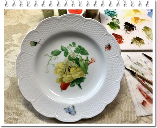 JUGEMテーマ:ポーセリン 毎日茹だる様な酷暑日が続いておりますね。 最近ではTVでも推奨している様に、朝までクーラーを付けています。 先日来、落雷で停電のニュースも見ましたが、停電に成ったら?と思うだけで恐ろしいですね💦 前回描き始めていたマイセン自然主義の野菜ブーケ 焼成後、2回目の絵付けに入りました やはりリムには虫さん達をお迎えしました( *´艸`) クーラー入りのアトリエですが、やはり早くも夏バテ? 粘りが効かず3枚だけ・・・ う〜ん、リム端部分は...
