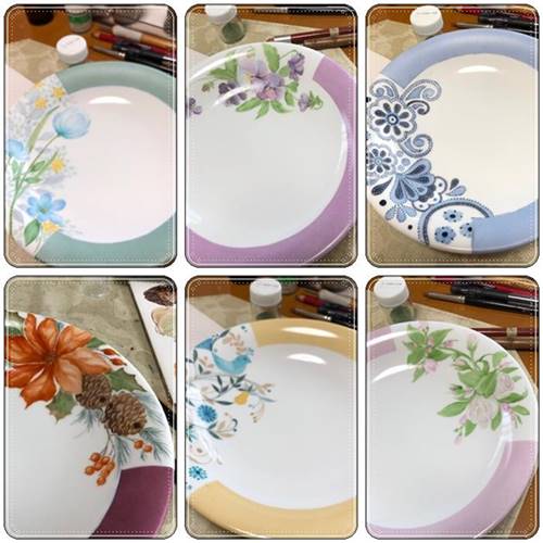 JUGEMテーマ:ポーセリン 暮しの中には、色んな図案のアイデアが! PCではフリー素材も有るし、素敵な包装紙、ちょっとした挿絵、アンティークカード等、etc. そんなものからヒントを得たりして、色んな図案も生まれます 今回は少しイラストチックな図案や、水彩画の様に描いてみたりとチャレンジです 同じフォルムの白磁が、こんな風に変身♫ あなたはどれがお好きかしら💕 20cm程の少し深みの有るプレート 日常使いに金彩を無くして、お料理を乗せる部分は出来るだけ絵付けを外して 1回目の絵付け...