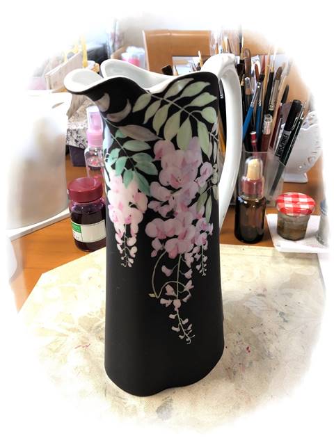 JUGEMテーマ:ポーセリン 現在15歳二か月の老犬の介護の中、時間を見つけてはアトリエにお篭り 4月16日から始まる、クレイアートフラワーの雪子先生との二人展に向けての作品制作 日にちが迫ってきているのに、メインになる作品が未だ仕上がらず(;^_^A アセアセ・・・汗 高さ30cm程のベース 水差しのような取っ手付き 地色に何色をしようか?・・・随分と迷い、落ち着いたところが黒 マスキングを外して、蔓も枝も細いので、地色を修正しながら綺麗にアルコールでお掃除中 小さい作品なら、同時に葉や花を加...