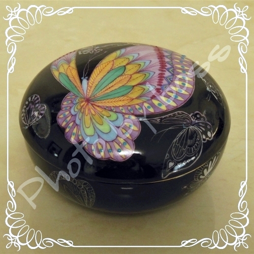 JUGEMテーマ:ポーセリン 久々に艶黒を使いたくなって やっぱりいい艶〜 いい仕事をしてくれますぅ そういえば、以前お重を描いた時に「これは漆ですか?」って聞かれたことも有った 珍しく蝶々〜♪ 小田陶器の蓋物、プックリとした蓋物 と〜っても気に入った蓋物、直径10cm程かしら 何を入れようかな? キャンディ? それとも大切な物?