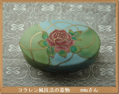 JUGEMテーマ:ポーセリン 一日コースのMIUさん 今回はコラレン風技法の蓋物にチャレンジ この技法は、ガラスビーズを装飾に使うのですが、それ以外の面は艶消し仕上げ この方が、よりビーズの質感が出るんです 静止画像ではなかなか煌めくガラスビーズの質感が判りませんが、光の当たり具合で、ガラスビーズが煌めくのでゴージャス〜 金彩の点盛りも綺麗に盛れました、頑張った甲斐が有りましたねっ