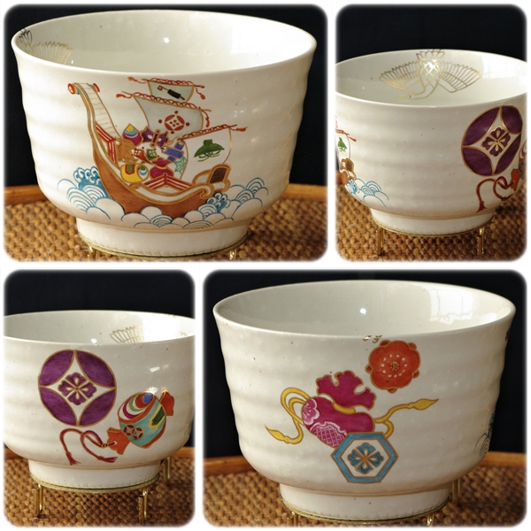 JUGEMテーマ:ポーセリン 世間様より、一足早く仕事納め、もちろん絵付けのお話ですぅ。 夏にオーダーを頂いていた抹茶茶碗。 金魚の飾り皿を描かせて頂いた方のご縁で、他の方からもオーダーを頂きました。 お二方ともお茶を嗜まれている方。 お一方は、お正月に使うお茶碗をと仰っていただき、ご相談して宝尽くしの様な物を描かせて頂きました 良く調べると、宝船は右向きが出船、左向きが入船という決まりが有るようです ならば、お正月早々にお宝を積んで外洋に出航するのではなく、たんまりとお宝を積んで福を持っ...