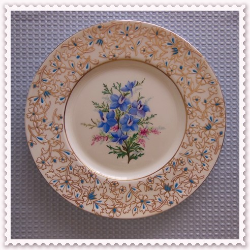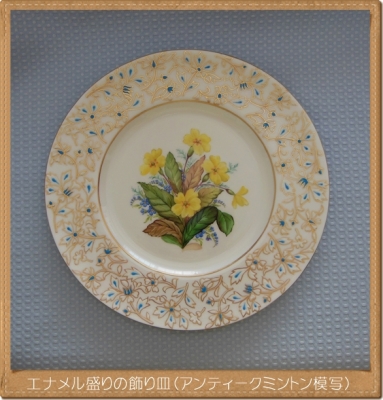 JUGEMテーマ:ポーセリン ミントンやウェッジウッドのアンティークには素敵な物が有る 今回は27cmのディナー皿(ローゼンタール)にミントンのアンティークを描いてみた 勿論、はじめは真っ白なお皿 中のお花部分と並行して、リム部分にエナメル盛りを施す 今回、エナメルと皿の釉薬の相性が良くなかったのか? トラブル発生 途中で投げ出すのも嫌だなぁと思い、再度エナメル盛りをして焼成 しか〜し修復できず、トラブルの上塗りになったようで、、、 この時点で金彩はどうしようか? と思ったが折角だから金...