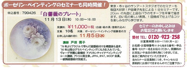 サンアート大阪のセール中に開催されたワンデーセミナー東京では色々開催されているようですが、大阪での開催はなかなかないのです。ダイレクトメールの下のほうに表記されていました。日程が合ったので直ぐ申し込みました写真会館でセール会場の隣のお部屋で「ワンファイヤーの白薔薇」お久しぶりにお会いした先生、私が参加すると分かって、とてもびっくりされて、、、、「ワンファイヤーで描いた事ないです、、、」4名参加で、少人数で私達にとってはとてもラッキーでした。東京からスタッフさんが来られていました。宣伝が足りなか...