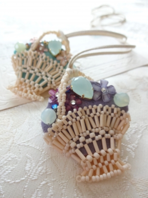 JUGEMテーマ:ビーズ 本日これからの季節に活躍しそうなアクセサリーを 数点UPいたしました。 竹ビースなどを使って編んだ繊細なかごに ストーンやフラワーパーツを留めつけた ブローチにもなるペンダント 花かごのブローチペンダント ミントグリーンのカボッションと連爪チェーンが ゴージャスなネックレス。 ミントグリーンの装飾的なネックレス *aquadrop*
