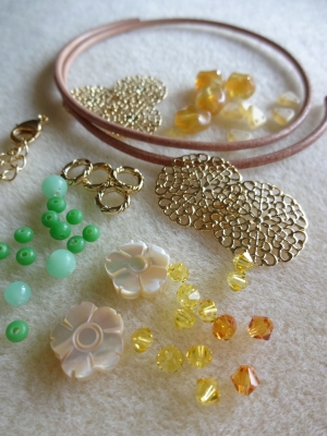 JUGEMテーマ:ビーズ ビーズを留めつけた透かしパーツを革ひもに繋いで...。 繊細な印象ののネックレスを作ります。
