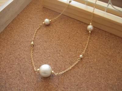 JUGEMテーマ:ビーズ コットンパールと金パールを チェーンでつなげたネックレスです。 以前のイベントの時にも作って、 写真を撮り忘れたまま 旅立っていったので 今回また作ってみました☆ 材料しかメモってなかったから 前のとはちょっと違うかもしれませんが(汗)。 ちゃんと作り方も書いておかないとダメですね〜。 気をつけたいと思います…。