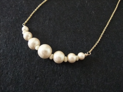 JUGEMテーマ:ビーズ ビーズのアクセサリー、新しいのを作りました。 大きさの違うコットンパールをつなげたネックレス。 コットンパールは こんなシンプルなデザインの方が 映える気がします。 まぁ、私がそんなに凝ったデザインが 出来ないだけなんですけど^^; もうちょっと寄りで撮ってみました。 ワイヤーに通してあるので 多少、カーブの具合を好みに調整できます。