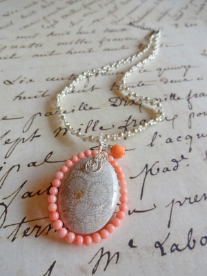 JUGEMテーマ:ビーズ本日7月の新作をupしました。フォッシュコーラル(珊瑚の化石)を使ったペンダント 珊瑚のペンダントジャパンビンテージを使ったモダンなネックレス ビンテージコニャックのネックレス *aquadrop*