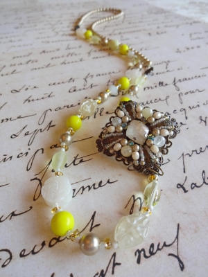 JUGEMテーマ:ビーズレモン色のアンティークビーズやウランガラスのビーズを使ってフェミニンなロングネックレスを作ります。 ハニーレモンのネックレス