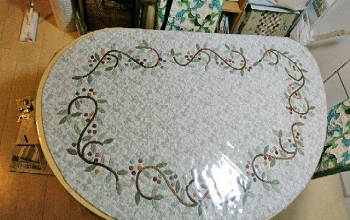 今日の天気は、晴れ・・・ 今日は、キルトサークル「たなばたの会」でした。 Nさんのテーブルクロスが完成しています。 キルティングした後にアプリケをして とても素敵なテーブルクロスが出来ました。 自宅で撮られた画像をお借りしてます。 そして次は、2個同時進行でバッグ作ってます。 Hさんも、バッグの布選びして ?さんは、カテドラルウインドウのクッションカバー作り。 パッチの後は、ランチを楽しんで・・・ 食べながら〜お喋りしながら〜の楽しい時間でした。 そして私の今日のパッチワークは...