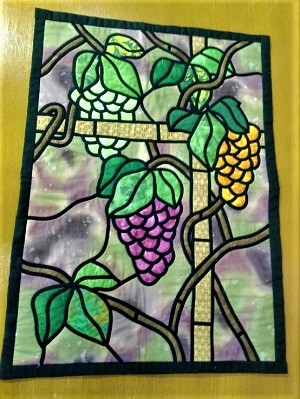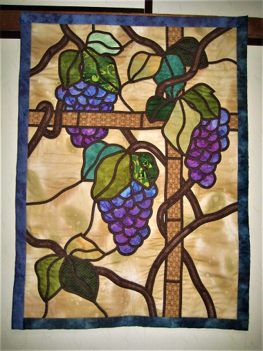 今日の天気は、雨・・・ 今日のパッチワーク画像、 ブドウのステンドグラスキルトが完成しました〜 サイズは、横 54cm。 縦 74cm。 バイヤステープは焦げ茶色のテープを使って パイピングも紺色系のムラ染め布2種類使いました。 ステンドグラスキルト、楽しかったな〜 また何か作ってみたいな〜 バッグのリバースアプリケのマツリも 少しずつマツってます。 それでは、また〜〜〜 JUGEMテーマ:パッチワーク