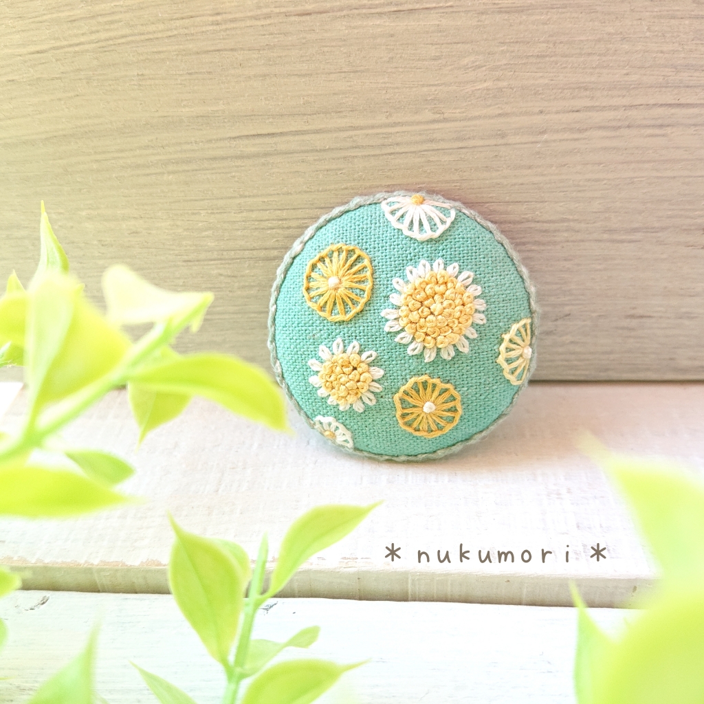 JUGEMテーマ:可愛いハンドメイド雑貨 しばらく 黄色を基調とした作品が続きますが どうぞお付き合いください😌 『刺繍ブローチ *リフレッシュ*』 布用絵の具で 土台の布を着色した 爽やかな印象の作品です。 いつもの作品とは ひと味違うデザインです。 木賊色(とくさいろ)の 絵の具で着色して...