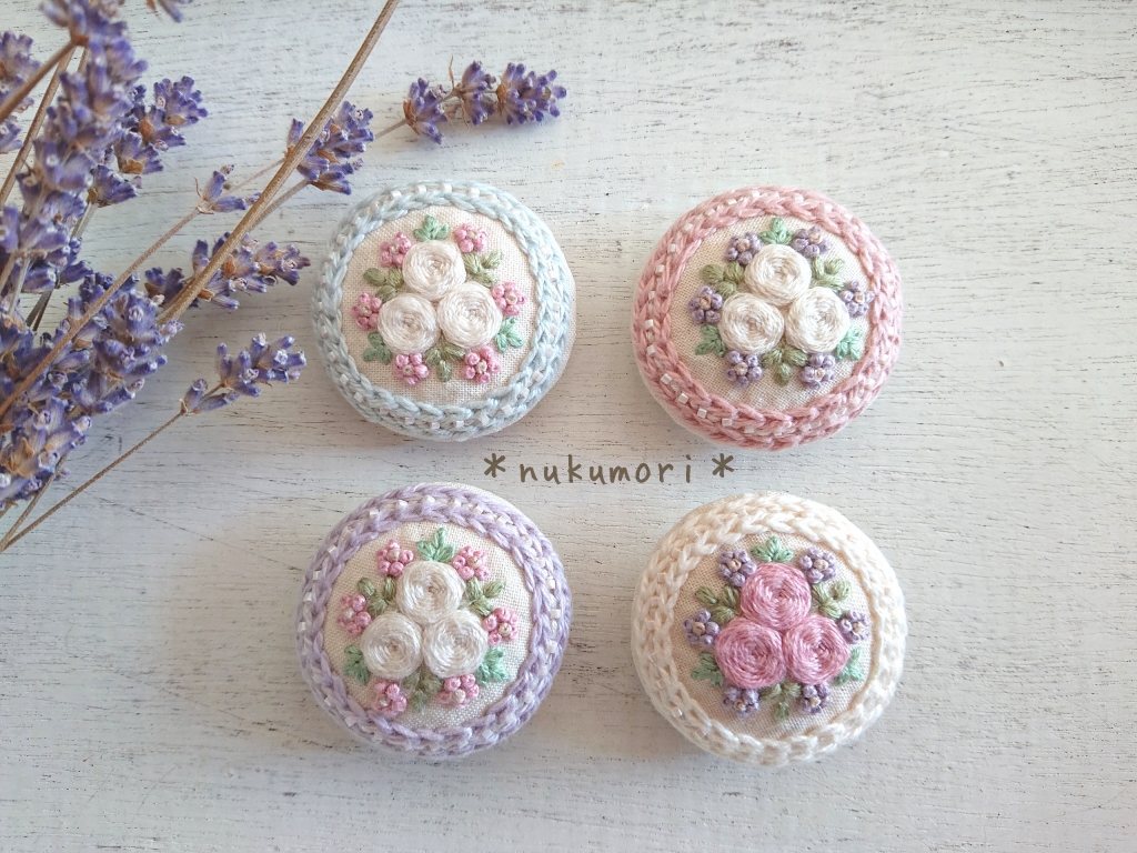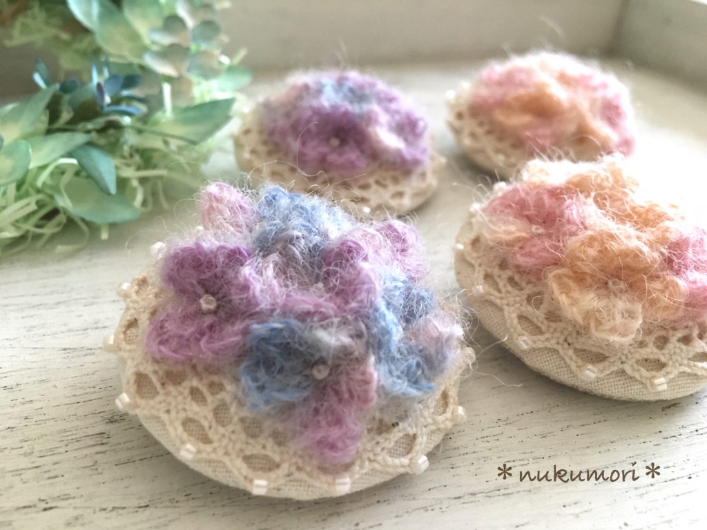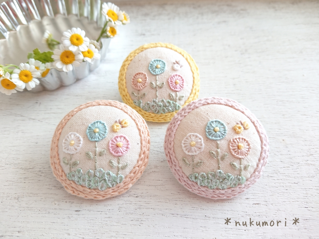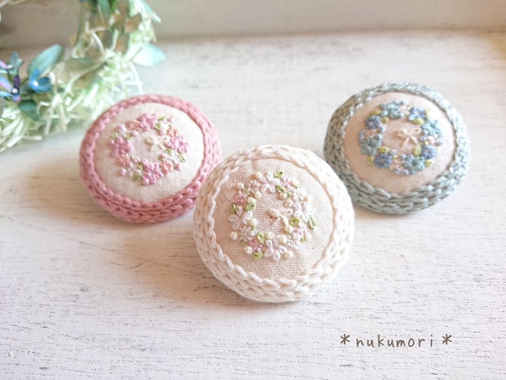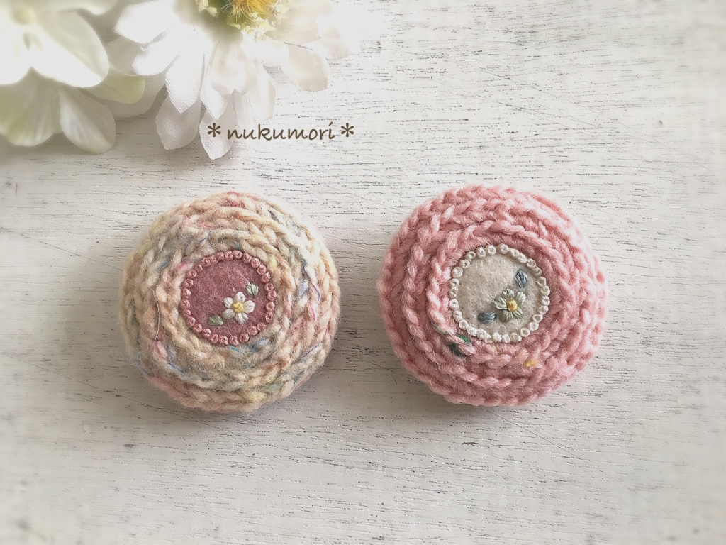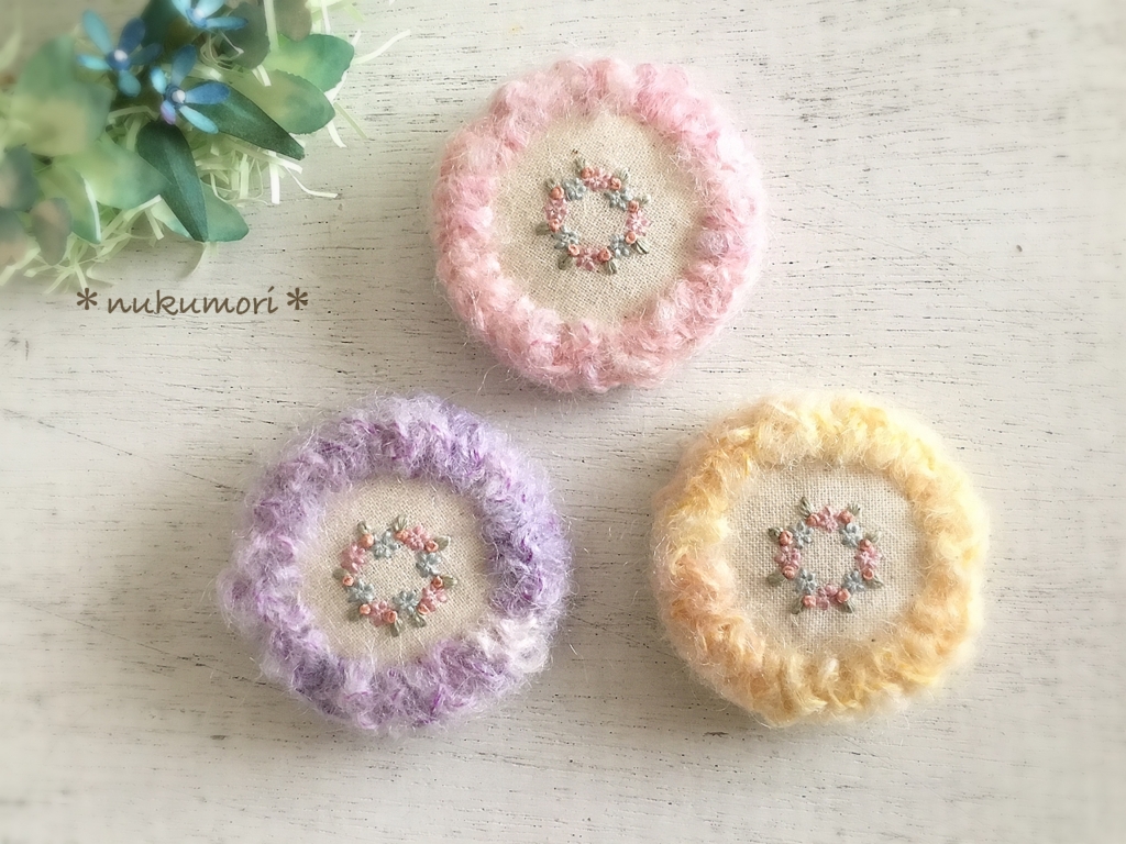 JUGEMテーマ:可愛いハンドメイド雑貨 こんにちは。 続いての作品紹介です。 2種類あります。 『陽だまりのブローチ *くるみボタン*』 コットンリネンの土台に ふわふわの毛糸をあしらい お花のリースを刺繍した オリジナルデザインのブローチ。 ふわふわ感を出すためにはどうすればいいか 試行錯誤を繰り返しました...
