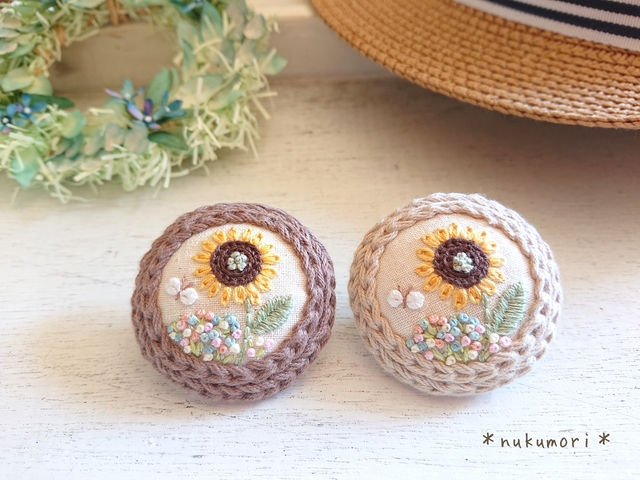 JUGEMテーマ:可愛いハンドメイド雑貨 こんにちは。 台風から離れているのに 雨風強いです。 大型の台風なので心配です。 『刺繍ブローチ *向日葵とお花畑*』 木枠をイメージした 茶系のコットン糸で周りを縁取って 一枚の絵画のような作品。 つつみボタンを使用して仕上げています。 太陽に向かって咲く向日葵。 ...