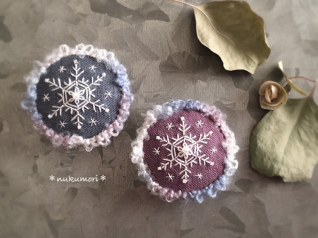JUGEMテーマ:可愛いハンドメイド雑貨 こんにちは。 今日も季節外れの作品のご紹介です(^_^;) 『刺繍ブローチ *雪の結晶*』 コットンリネンの布に 雪の結晶を刺繍した オリジナルデザインのブローチです❅ 周りのふわふわの毛糸が温かみを 周りのガラスビーズと中央のイミテーションパールが 立体感を出しています...