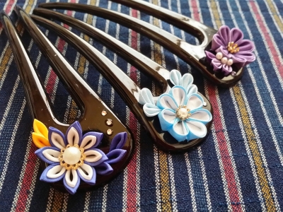 以前から作りたいなと思っていた簪が、ようやく形になりました。 夏らしく、大人が自然に使って頂けるような色合いを模索していますが、 紫のものは、藤の重ね、 真ん中は水色の重ね、 左下は、藍色の浴衣に黄色い帯をイメージしています。 全て絹の羽二重なので、ちりめんよりも涼しげで軽やかな感じになりました こちらもマルシェにお持ちします JUGEMテーマ:手作り/ハンドメイド雑貨:和心で生...