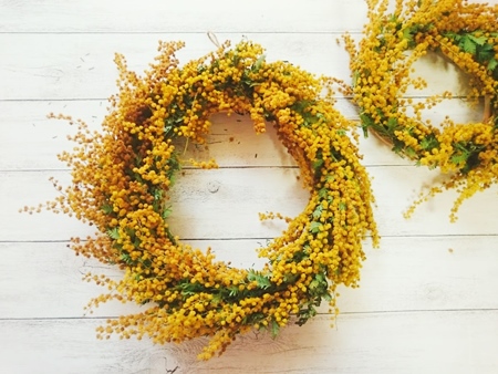 作りたいな〜と思いつつ、手に入らず出来なかったミモザのリース。 よく行くスーパーに入荷されていたのだけど 2束しかなくて、どちらもドライになりかけ…。 でも憧れのミモザだったので買っちゃいました。 帰りに100均に寄り、リース台とワイヤーを買ってリース作り。 初めてで苦戦したけど、なんとなくカタチになってよかった* 念願のミモザリース。やっとできたー!かわいい♪ (小さいのは余ったミモザで作ったので、ボリューム無しデス) 私の部屋に飾っていますが、触る...