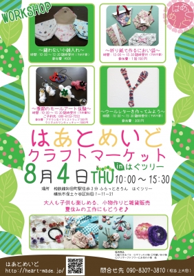 JUGEMテーマ:可愛いハンドメイド雑貨 ロザフィ認定講師&パステリア書インストラクターのakkoです。 8月4日(木)10:00〜15:30 相鉄線和田町駅徒歩3分 ふらっとサロンはぐ・ツリーにてクラフトマーケットが開催されます。 楽しいワークショップと小物の販売があります。 ぜひ遊びに来てください。 応援お願いします。 人気ブログランキングへ ロザフィ・パステリア書講...