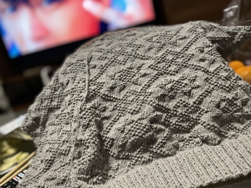 JUGEMテーマ:編み物 投稿が前後していますが。 亀の歩みで進んでいたセーターですが。 パーツが編み終わりました。 ででん。 最初はあまり模様と糸の相性がイマイチかな…?と危惧していたのですが そんなことなかったですね。綺麗はっきりと模様が出ました。 ふっくらしているタイプの糸だと、また違った表情になるかもしれません。 あとは繋げて襟を編むだけ。 とじはぎが、ある程度模様...