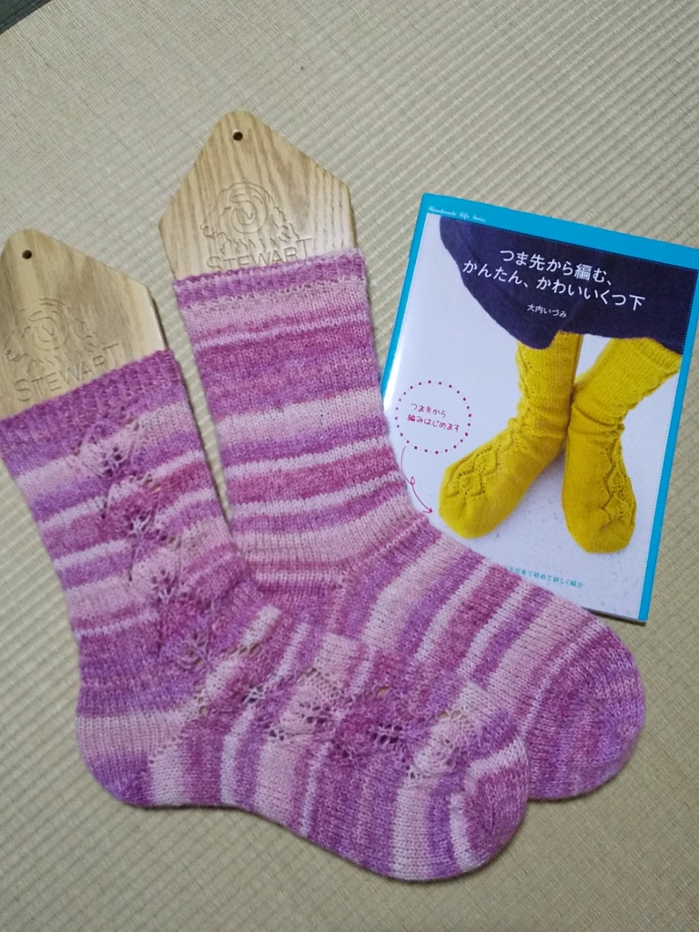 今期2足目の手あみ靴下、出来上がりました〜! (*´▽`*) この表紙の靴下をXLサイズで。 つま先から編み、16目、1段おきに増やし目をして32目に。 56段編んでかかとをつくり、葉っぱ模様が8個のところ(トータル128段)で、履き口をねじり一目ゴム編みに。 JUDY式伏せ止めで閉じました。 この糸は何だろう?福袋?? PROLANA MEINE WOLLE ゴールデンソックス4−FACH THIMOS ルーマニア製です。 写真は青み...