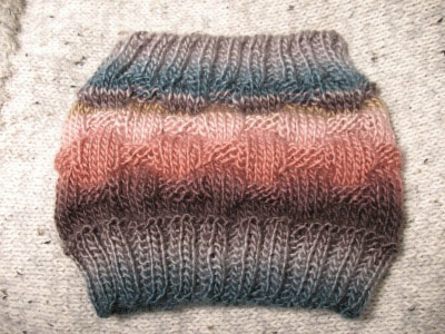 JUGEMテーマ:編み物 今日はバイトはなかったんですが、朝からしんしんと雪が降り積もり 午後は小一時間ほど雪かきで汗を流しました。 ので、夕方の「ばあちゃんのエアロビタイム」は、しっかりサボりました。 午前中と夕食後にがんばって4つめのネックウォーマーを 仕上げました! 夜の室内で撮影したのですが、ほぼ色合いはこのままです。 パターン: VanessaさんのWeaver's Cowl (Ravelry) 毛糸: Cygnet BOHO Spirit Snuffle Bean Yarn 針:4.5mm 棒針5本 糸が細めで撚りも...