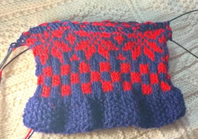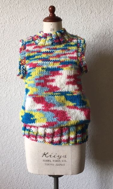 JUGEMテーマ:編み物 水仕事の多い日用に、ベストか半袖セーターが欲しいと思って罪庫を探したところ、3〜4年前に手芸店の福袋で買ったアクリル・ウール混紡糸を発見。色が私には派手すぎて罪庫化してましたが、家用のベストなら派手でもいいか、ということで編んでみました。 腕ぐり・袖ぐりとも前後同じにして、スポッとかぶれるようにしました。派手だけど、レゴブロックみたいな明るい色柄で、気乗りのしない水仕事も少しはやる気が出そうです。 オマケ:余り糸の室内履き。途中で糸が足り...