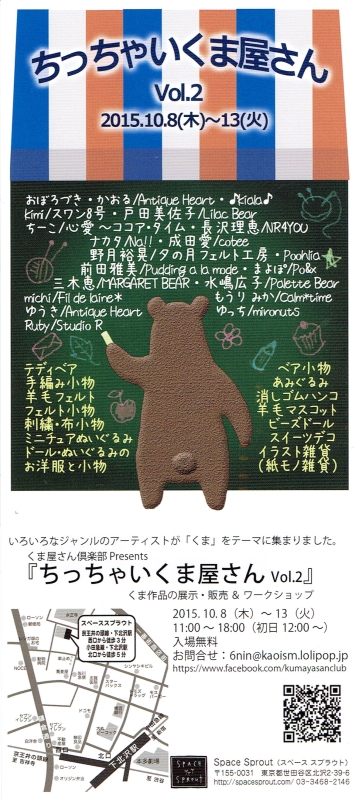 こんにちは。 先日ブログを書いた時の曇りがちな空が一転、爽やかな晴れのお天気に変わりました。 昼間は寒くなく暑くなく、心地よい気候で、この土日は行楽日和ですね。 皆さん色んなところへ出かけられているんだろうなぁ。私は週明けから始まる 3つのイベントに向けて、ひたすら家にこもって準備をしております。 イベントが終わったらどこかへ出かけたいです(^-^) 今日は今月開催のイベント2つ目、東京・下北沢のギャラリー、スペーススプラウトで 10/8(木)〜13(火)に開催されます『ちっちゃいくま屋さん Vol.2』をご案内...