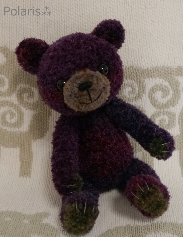 JUGEMテーマ:愛しのテディベア! 本日は、すみれの花をイメージしたベアのふたり目をご紹介します*男の子ベアです〜^^。サムネイルです。写真をクリックすると詳細表示となり、ブラウザの「戻る」で再びこちらの記事に戻ります。鼻まわりのエンジ色は、毛糸特有のものです。紅葉のベアの毛糸に入っているものと同じ色です^^。毛糸は、ハマナカ「モールレジーナ」。カレは、下の毛糸です。同じ編み図を使用し、5号かぎ針で編みました。鼻まわりは、紅葉のベアと同じ毛糸の 黄色と紫色のミックスの部分で、肉球は、晩夏の...