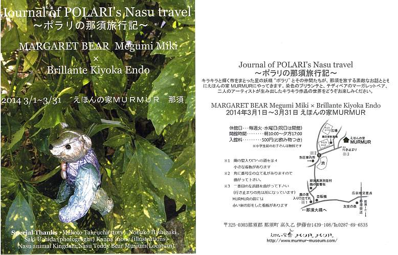 2014年 3/1(土)から31(月)までの1ヶ月間開催されます『Journal of POLARI's Nasu travel 〜 ポラリの那須旅行記 〜』のご案内です。昨年誕生した、キラキラ布とのコラボのテディベアが、星の妖精 “ポラリ” というキャラクターになり、栃木県那須を舞台とした物語になりました。遠い星から降りてきて、那須を旅するポラリの物語を、キラキラ布でできた作品や、那須で撮影されたポラリのたくさんの写真ともにお楽しみ頂ける展示となっています。<ポラリ誕生のこと>ポラリを作るきっかけとなったこと。それは、昨年4月に参加したイベ...