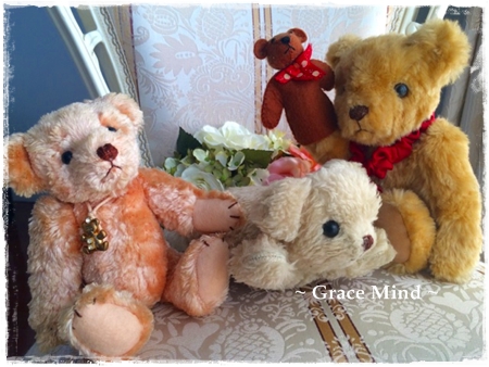 今から20年ほど前、娘が生まれてしばらく経った頃に たまたま出会った洋書に書いてあった【生まれた娘の幸せを願ってひと針ひと針縫うテディベアの風習】に胸を射抜かれ、型紙から用意し、我流のハンドメイドでひと針ひと針、心をこめて作り上げたテディベアたちがこちら。それぞれに『シュガー』『ミルク』『ココア』『カカオ(ハンドパペットの子)』と当時の娘と一緒に考え名付けた名前もついています。ピンク色の『シュガー』とブラウンの『ココア』にはちゃんと手足にジョイントも縫いこんで作成してあるので自由に動かせます。こ...