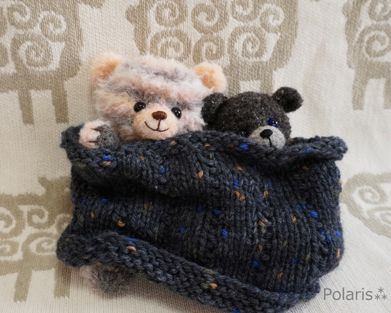 JUGEMテーマ:愛しのテディベア!本日の最初は、登場したばかりの 春のたまご・ベアと、星降る夜のベアです。 「あたたかいわ*」 「これなら、 星を ゆっくり見られますね。」ふたりのお気に入りは、シュンのネックウォーマーです^^*毛糸は「スターメツィード」で、使用量は1玉弱の約40g。10号の輪針で編みました。一周50cmで、高さは17cm、丸めて ポケットに入れられるサイズです^^*私のスヌードを お昼寝ベッドにしているのは、続・シャイニーピンク・ベア。三國万里子さんレシピのどんぐり...
