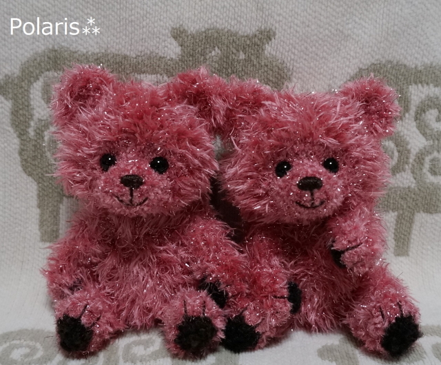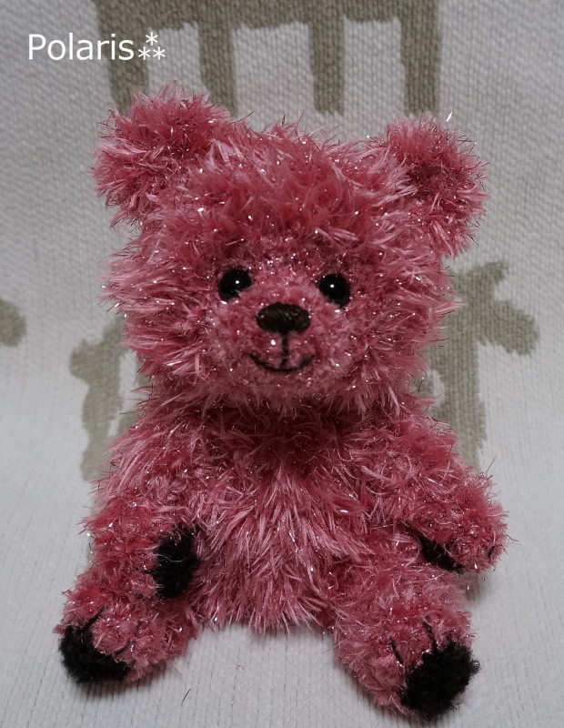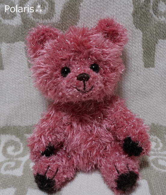 JUGEMテーマ:愛しのテディベア! ピンク色の、キラキラなベアができました**サムネイルです。クリックで、より鮮明な画像をご覧いただけます。ブラウザの戻るボタンで、記事に戻ります。毛糸は、オリムパス「シャイニーファー」。ラメのフィルムが入った、きれいな色展開の、扱いやすい毛糸です。5号かぎ針で編みました。肉球は、ハマナカ「ループル」の濃いブラウンです。顔の毛先の流しかたで、雰囲気が少し変わります^^*座った状態で、高さ約14cmです。*昨年登場の、 シャイニーオレンジ・ベアはこちらです...