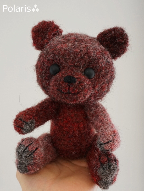 JUGEMテーマ:愛しのテディベア! 実りの秋です♪クランベリー色の ベアができました*サムネイルです。毛糸は、リッチモア「アルパカビネット」。ふわふわに起毛された、軽いロングピッチ・グラデーションの毛糸です。この毛糸玉では、外側が薄いレッド、中心が濃いレッドです。複雑な色出しが素敵な毛糸です。色味を合わせて、2本どりにし、6号かぎ針で編みました。少しかすれた起毛の風合いには、アンティーク・グラスアイを合わせたかったので、頭部に暗めのグラデーションを持ってきて、なじませました。片腕、片足を薄...
