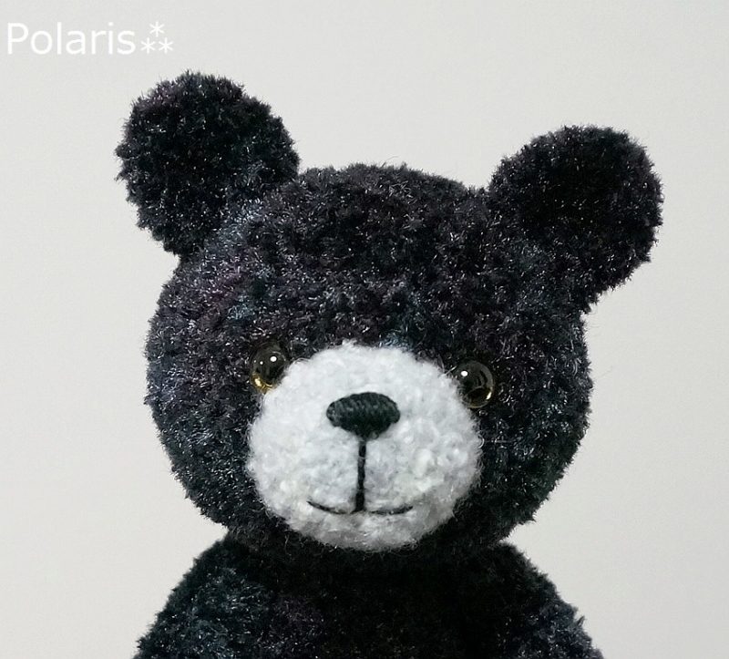 JUGEMテーマ:愛しのテディベア! 本日のベアは、瞳が映りにくいので、顔のアップからご紹介させていただきます。とっても変わった毛糸のベアが、できました~^^*サムネイルです。毛糸は、変わり糸はおまかせ^^* パピーの、「ストレーザ」です。ラメ、光沢糸、モールがランダムに入った、華やかな毛糸です。2本どりにして、6号かぎ針で編みました。インパクトのある表面感なので、グラスアイは、ピンク×ブラックにして少し柔らかさを出し、手足の先は、ブラウンの刺繍のみにしました。座った状態で、高さ約17cmです...