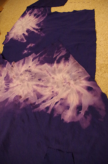 JUGEMテーマ:ニットソーイング♪ 染めではなく染まっているのをわざわざ抜いて模様をつけるという技法です。スリットは他の作品でやったからまぁいいでしょ〜という事で、ドルマンスリーブのトレーナーを作りました。Cちゃんが「おもしろい服がない」と言って新しいのを買わずに毛玉だらけ。この脱色で面白いと言わせてやるわよパターンは【LT-126】なんだけど、Cちゃん好みのゆるい形に変更。元は普通の丸首で襟ぐりと袖口がリブですが。クシュクシュクシュってやって真ん中つまんでキューと捻るのを並べました。教室の流し台で...
