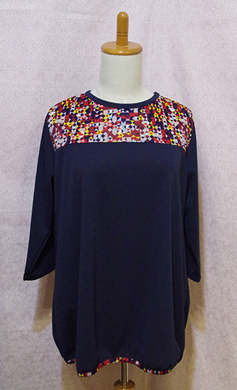 JUGEMテーマ:ニットソーイング♪ 柄のほう。ニットソーイングクラブ夏のバーゲンで買いました。ほど良い厚みで扱いやすいし縫いやすいし、色もキレイだけど、これで何をしようとしたのかさっぱりわからない。自分がわからない。柄の中の一色、紺色を合わせてなんとか落ち着いてもらいました。赤や黄色じゃちょっとね黄みがかったグレーでも良かったかね。でもグレーは濃いのが好きだからパス。で、このパターンそのままだと丈が膝くらいまでありそう。「ネグリジェ」みたい短くしたのを見た事があって、使えそうだったの思い出して...